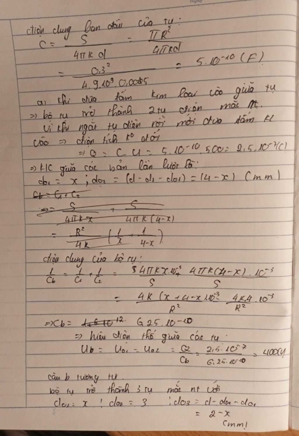 a. Sau đó ngắt tụ ra khỏi nguồn điện và đưa vào khoảng giữa hai bảng một tấm kim loại dày d1=1mm theo phương song song với các bản. Tìm hiệu điện thế giữa các bản khi đó