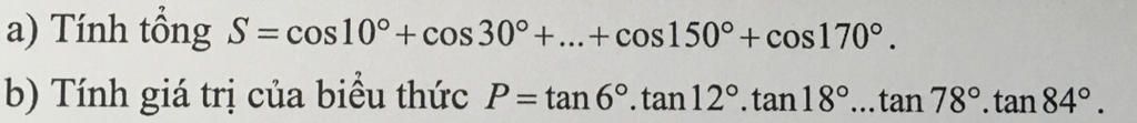 a)Ta có:`cos10^o + cos30^o + ... + cos150^o + cos170^o`