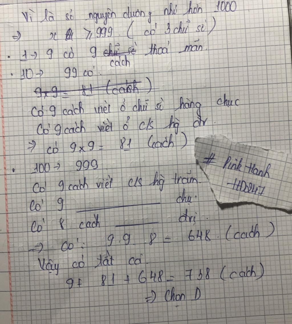 Số số nguyên dương nhỏ hơn $1000$ mà các chữ số của nó khác nhau lập được là: