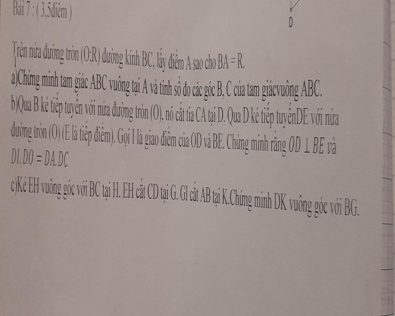 b.Ta có: $DB, DE$ là tiếp tuyến của $(O)\to DO\perp BE$