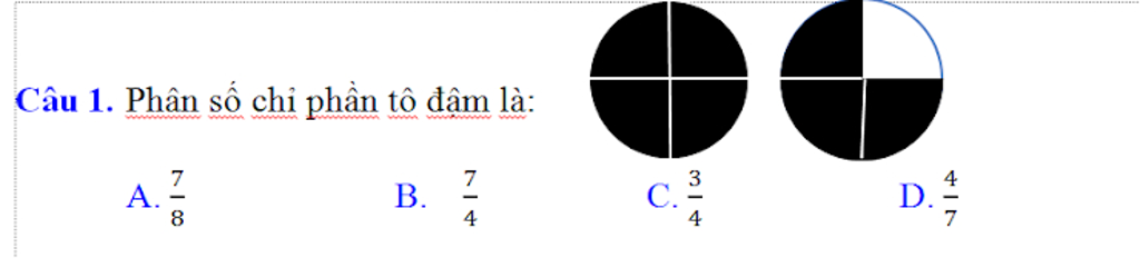 Câu 1 : Đáp án đúng là A : 7 phần 8