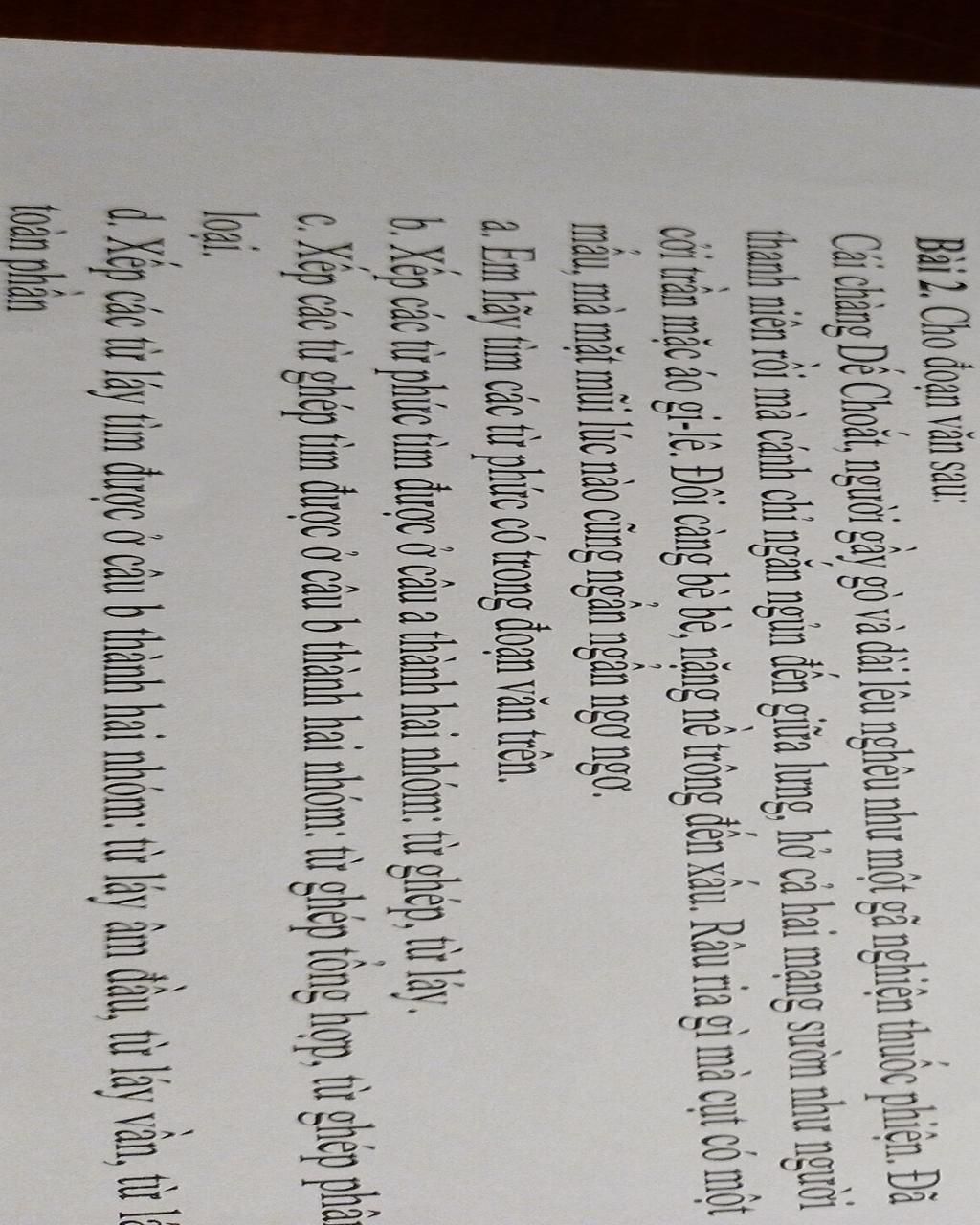 a,Các từ phức có trong đoạn văn là : gầy gò , lêu nghêu , thuốc phiện , thanh niên , ngắn ngủn,mạng sườn ,cởi trần, bè bẻ , nặng nề , râu ria , mặt mũi,ngẩn ngẩn ,ngơ ngơ,Dễ Choắt , đôi càng ,áo gi-lê