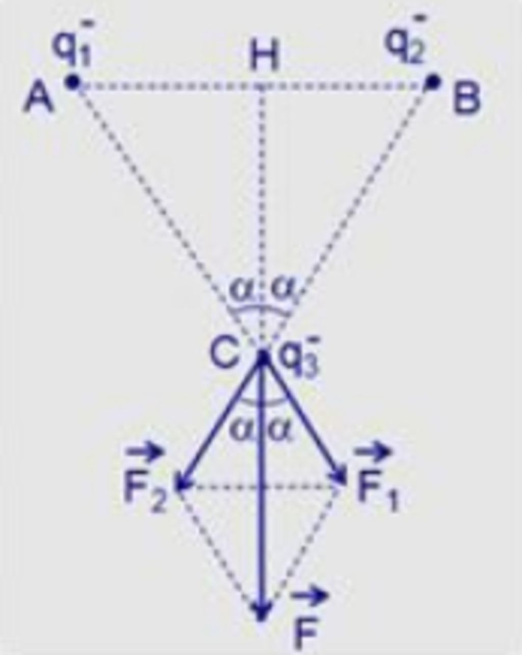 ${{F}_{13}}={{F}_{23}}=k.\dfrac{\left| {{q}_{2}}{{q}_{1}} \right|}{{{a}^{2}}}={{9.10}^{9}}.\dfrac{{{(1,{{5.10}^{-6}})}^{2}}}{0,{{15}^{2}}}=0,9N$