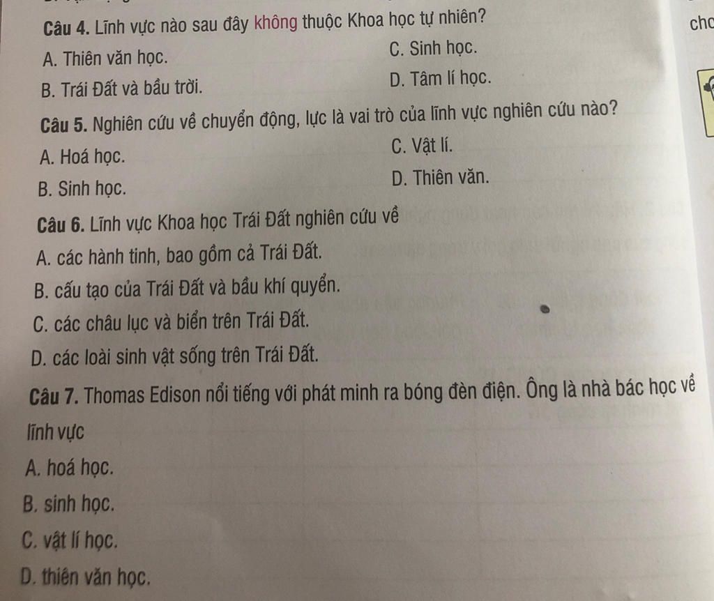 Câu 4 D ( vì tâm lý học thuộc về ngành khác ko phải thuộc về khoa học tự nhiên)