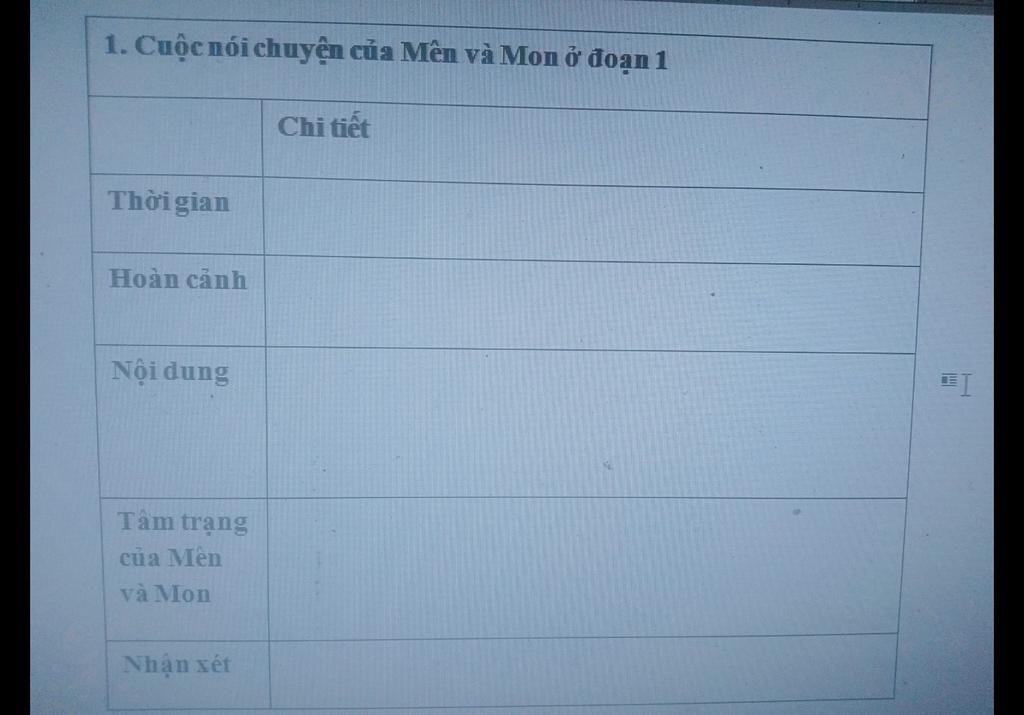 -Thời gian:Khoảng 2 giờ sáng. -Hoàn cảnh:Mon thức dậy và quay sang Mên trong lúc trời đang mưa to -Nội dung:Lo lắng cho tổ chim chìa vôi ở bãi cát giữa sông bị nước cuốn trôi và muốn ra cứu bầy chim. -Tâm trạng:Lo lắng cho bầy chim chìa vôi non bị chết đuối. -Nhận xét:Mên và Mon là hai cậu bé tốt bụng,nhân hậu,yêu thương động vật.Hai cậu bé có tâm hồn trong sáng ,hồn nhiên,đáng yêu. Rút gọn-Thời gian:Khoảng 2 giờ sáng. -Hoàn cảnh:Mon thức dậy và quay sang Mên trong lúc trời đang mưa to -Nội dung:Lo lắng cho tổ chim chìa vôi ở bãi cát giữa sông bị nước cuốn trôi và muốn ra cứu bầy chim. -Tâm trạng:Lo lắng cho bầy chim chìa vôi non bị chết... xem thêm