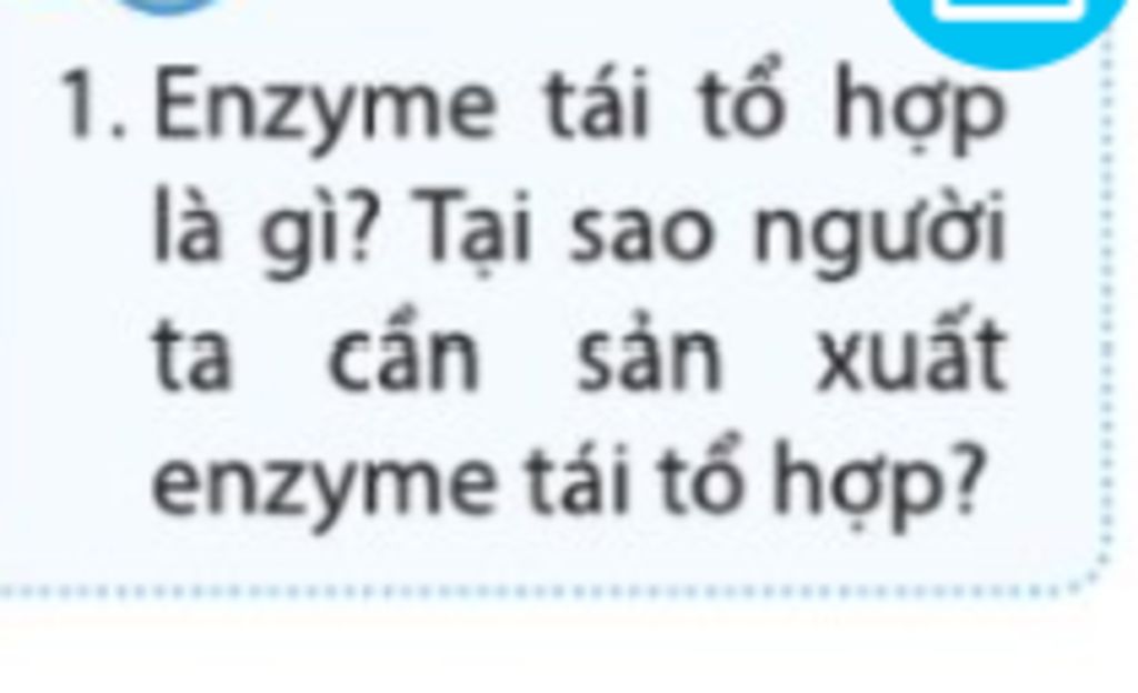 * Enzym tái tổ hợp là enzym được sinh tổng hợp từ phân tử ADN tái tổ hợp đã được chuyển vào tế bao chủ. Trong đó phân tử ADN tái tổ hợp là phân tử ADN có 2 nguồn gốc trở lên, một phân phân tử ADN tái tổ hợp là từ vector chuyển gen và phân còn lại là từ ADN sinh vật có nguồn gen mã hoá protein đích.