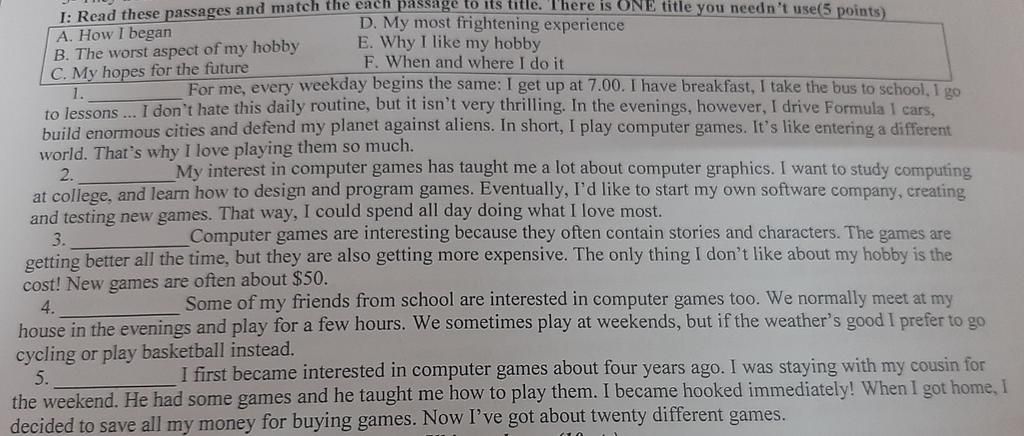 I: Read these passages and match the each passage to its title. There is ONE title you needn't use(5 points)