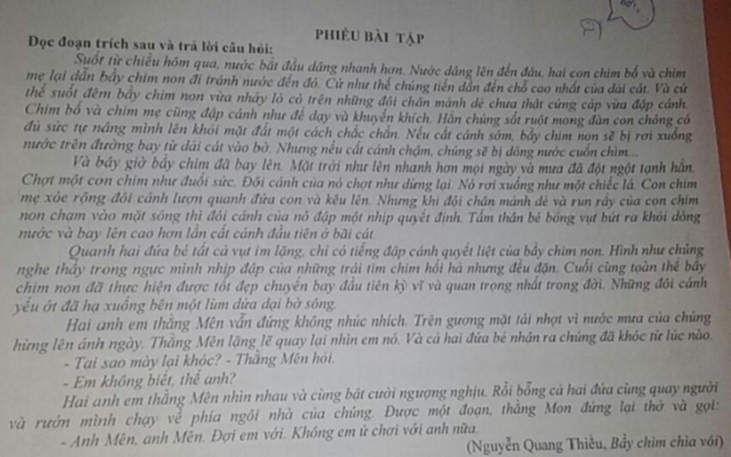 `+`hai con chim bố và chim mẹ lại dẫn bẫy chim non đi tránh nước đến đó. Cử như thế chúng tiến dẫn đến chỗ cao nhất của dải cát. Và cứ thể suốt đêm bầy chim non vừa nhảy là cỏ trên những đôi chân mảnh dẻ chưa thật cứng cáp vừa đập cánh Chim bố và chim mẹ cũng đập cánh như để dạy và khuyến khích. Hẳn chúng sốt ruột mong đàn con chồng có đủ sức tự nâng mình lên khỏi mặt đất một cách chắc chắn.