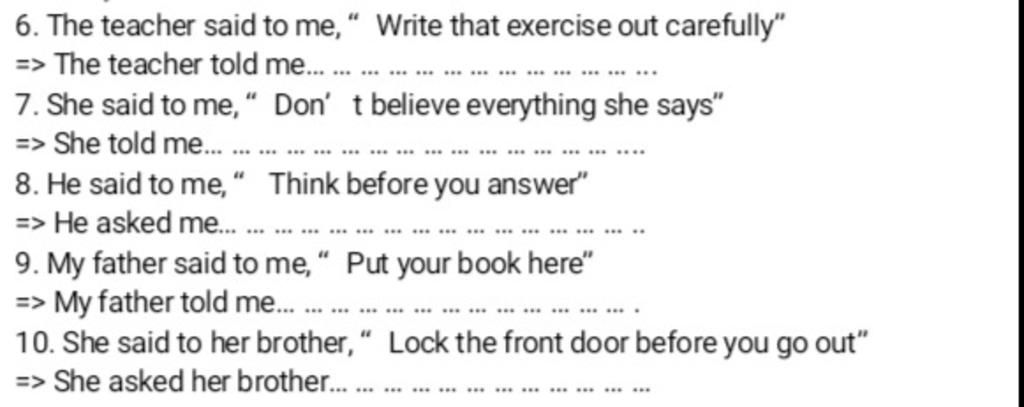 `=>` S + asked / told / ... + O + ( not ) to do sth