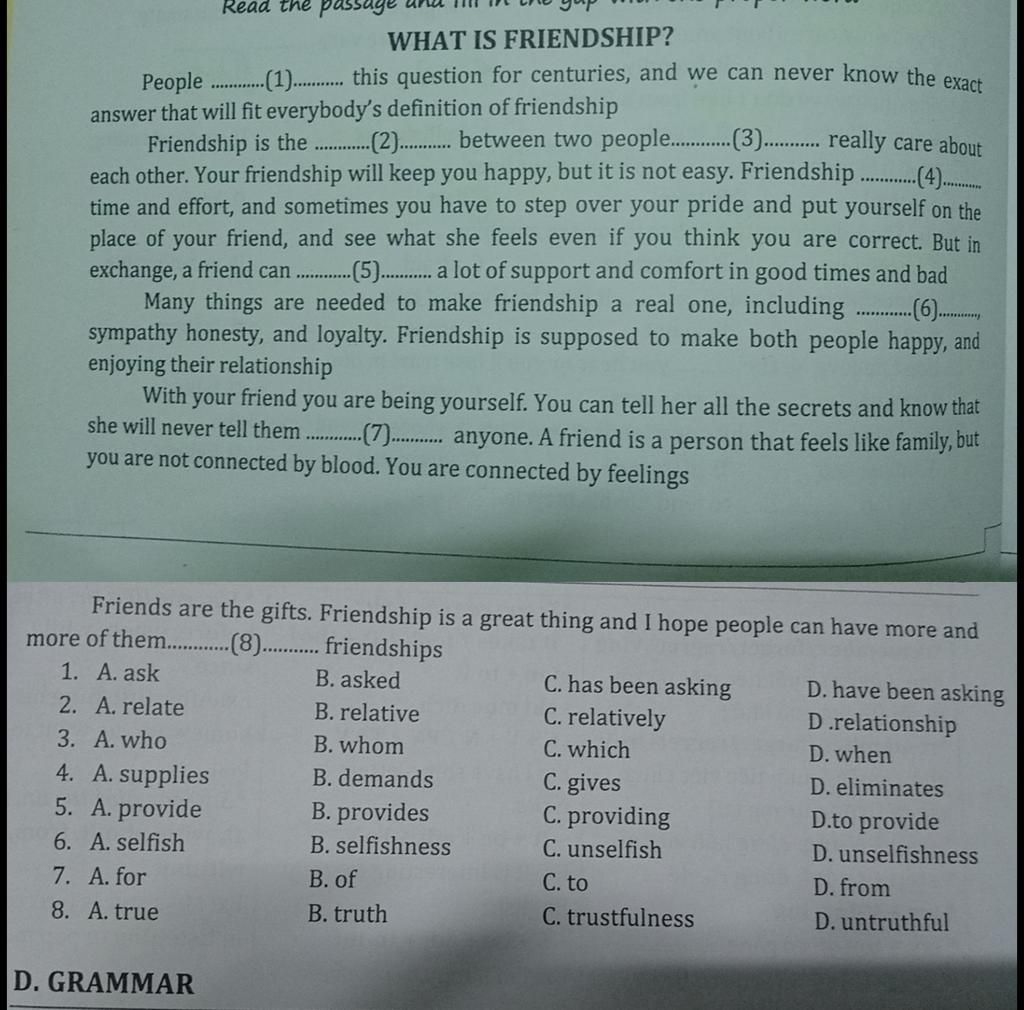 `-` Trước danh từ friendship (tình bạn), ta cần từ loại phù hợp nhất đó là tính từ.
