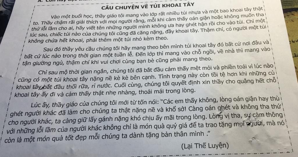 Trong câu chuyện, khi quẳng được số khoai tây nặng nề, rỉ nước đầy tên những người mình không ưa hay giận ghét, ai cũng cảm thấy nhẹ nhõm trong lòng. Tha thứ cũng vậy! Người được tha thứ vui mừng đã đành. Người tha thứ cũng cảm thấy trút bỏ được sự hận thù, thấy tâm hồn mình trở nên thanh thản, nhẹ nhàng. Phải chăng đó thực sự là một “món quà” quý giá, tốt đẹp mà chúng ta dành tặng cho chính bản thân chúng ta. Lời nói của thầy thật có ý nghĩa. Đừng tưởng tha thứ cho ai là chúng ta đã làm phúc cho người đó, thật ra là chúng ta đang làm phúc cho chính mình. Vậy thì còn chần chừ gì nữa mà không tha thứ, trút bỏ hận thù ? Hãy làm ngay khi chưa quá muộn !