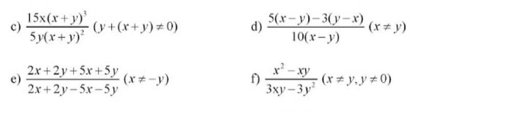 `c) \frac{15x(x + y)^3}{5y(x + y)^2} (y + (x + y) \ne 0)`