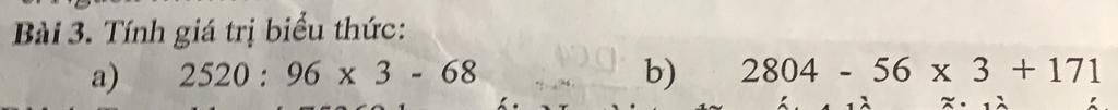 a) 2520 : 96 x 3 - 68 b) 2804 - 56 x 3 + 171