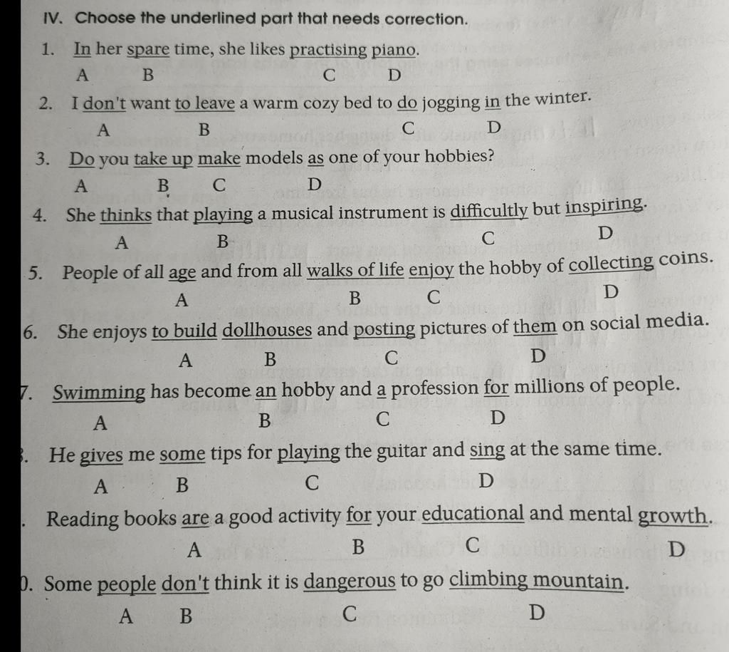 IV. Choose the underlined part that needs correction.
