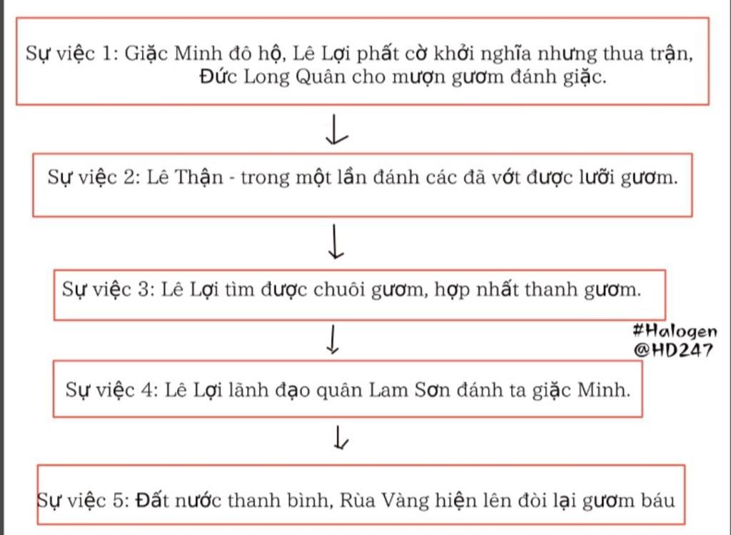 Sự việc 1 : Giặc Minh đô hộ nước ta , Lê Lợi dựng cờ khởi nghĩa nhưng bị thua do lực lượng còn yếu nên Đức Long Quân cho nghĩa quân ta mượn gươm thần để đánh giặc .