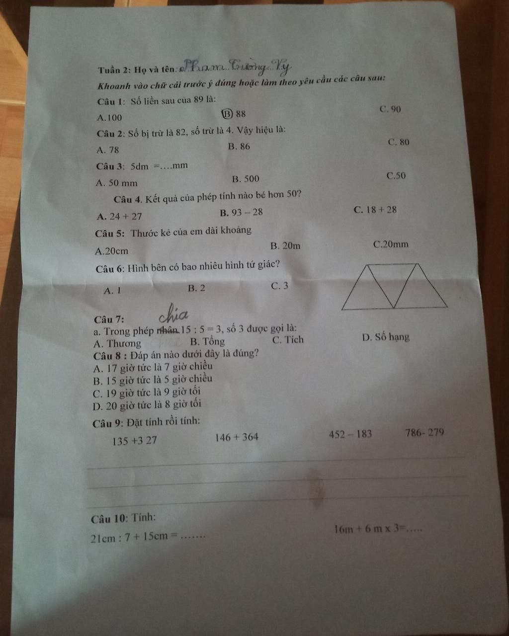 $\text{ 7 . Trong phép chia : 15 : 5 = 3 số 3 được gọi là thương}$