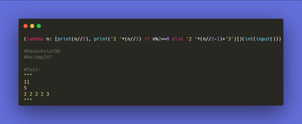 (lambda n: [print(n//2), print('2 '*(n//2) if n%2==0 else '2 '*(n//2-1)+'3')])(int(input()))