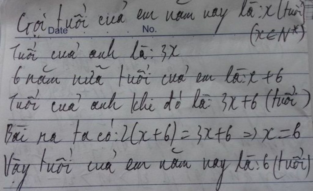 6 năm nữa, tuổi em và tuổi anh lần lượt là x + 6 và 3x +6
