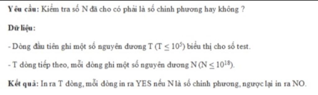 số chính phương là số có căn bậc hai là số nguyên, nên nếu căn bậc hai của n bình phương lên ko = n thì ko phải số chính phương (nguyên nhân là do c++ tự làm tròn số thực)