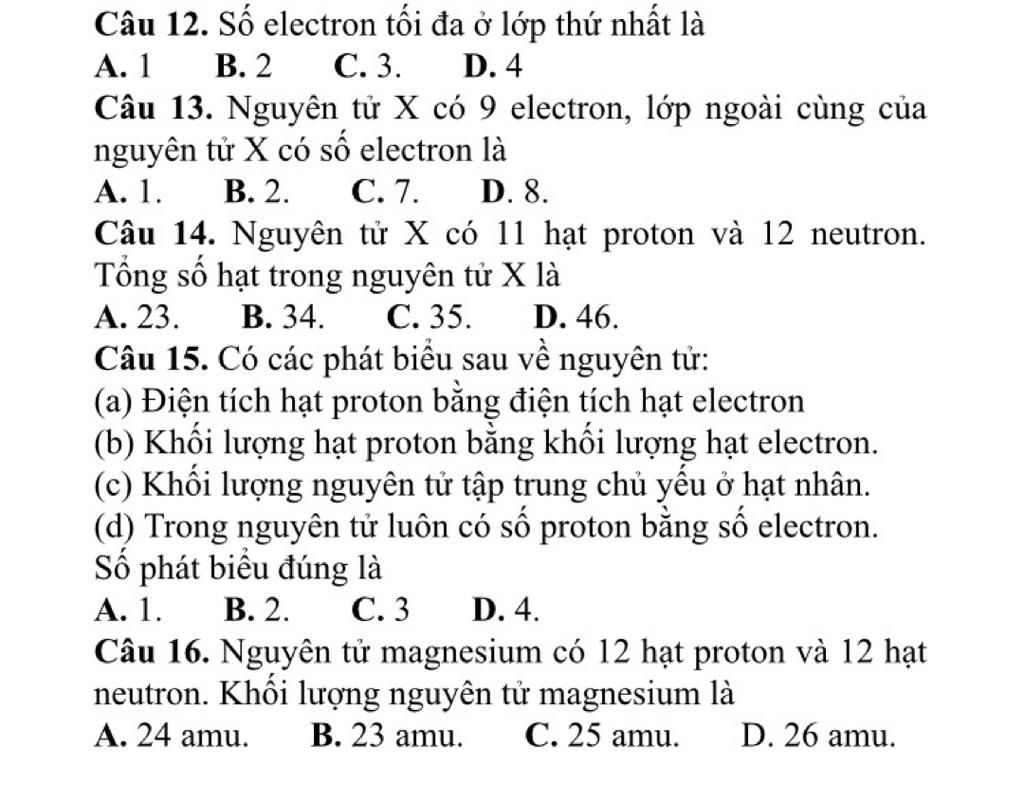 Câu 12. Số electron tối đa ở lớp thứ nhất là