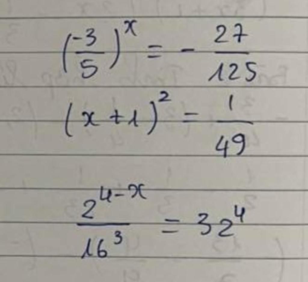 `( (-3)/5 )^x = ( (-3)/5 )^3`