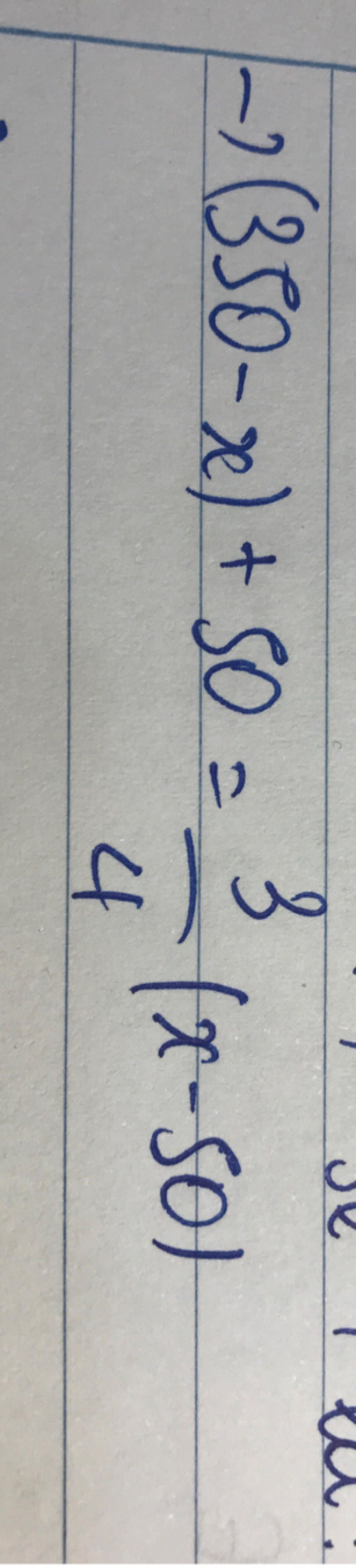 `( 350 - x ) + 50 = 3/4 ( x - 50 )`