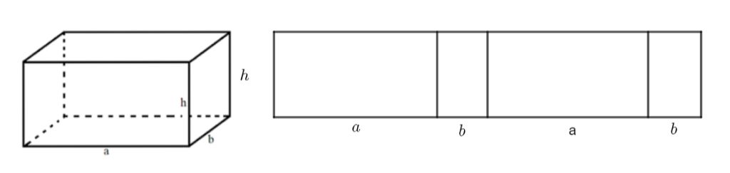 Hình hộp chữ nhật có 3 kích thước a, b, h như hình vẽ. Diện tích xung quanh của hình hộp chữ nhật là phần diện tích hình hộp chữ nhật bỏ đi hai mặt đáy, khi mở diện tích xung quanh ra ta được một hình chữ nhật có chiều dài bằng chiều cao h của hình hộp chữ nhật, và chiều dài bằng chu vi của đáy (a+b)x2 (như hình vẽ).