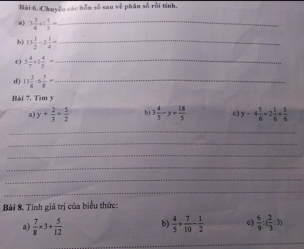 Bài 6 đổi hỗn số ra phân số, rồi quy đồng mẫu số và cộng vào.