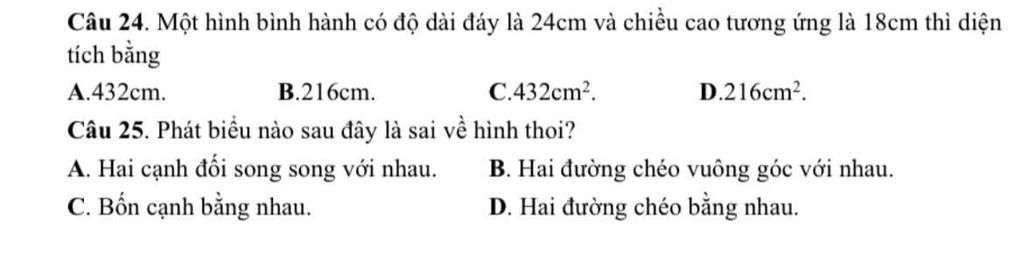 `=>` Chọn `D.` Hai đường chéo bằng nhau