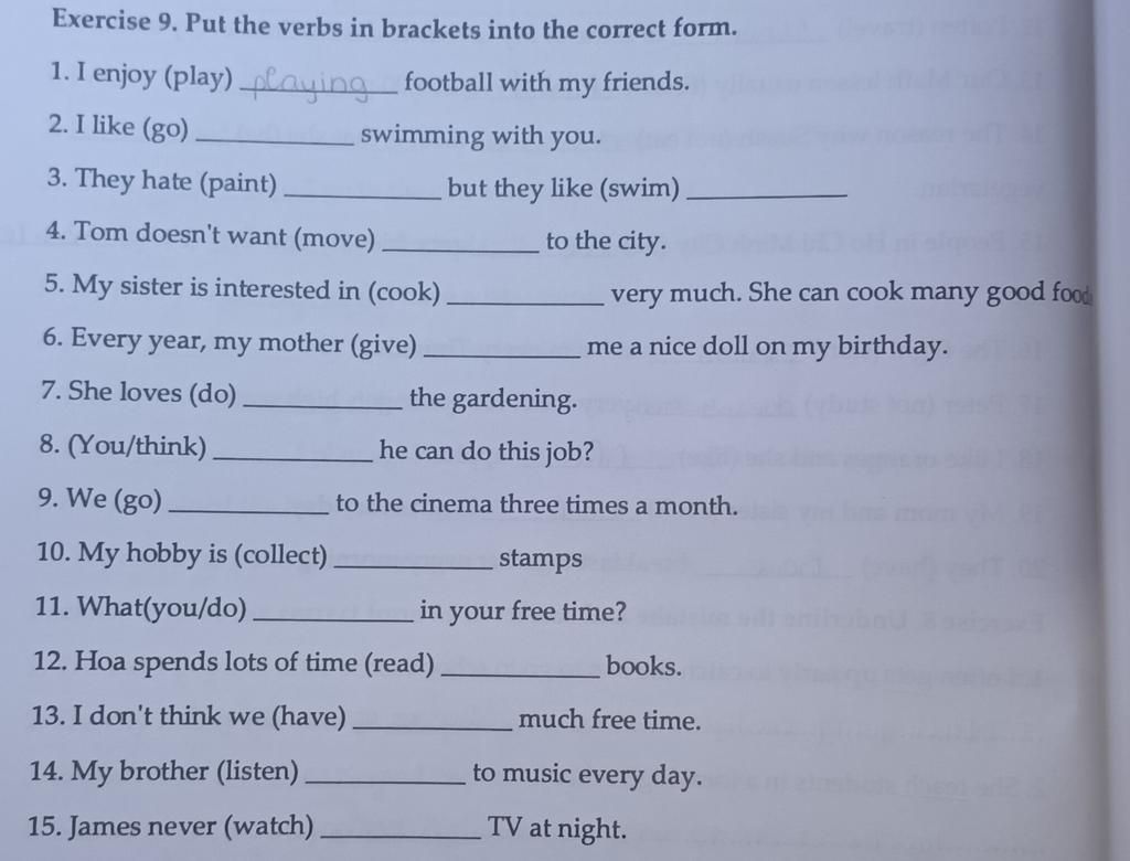 1. playing ( enjoy Ving) 2. going / to go ( like Ving/ to v) 3. painting....swimming (hate/ like Ving) 4. to move (want to V) 5. cooking ( be interested in Ving) 6. gives ( every year thi hien tai don) 7. doing ( love Ving) 8. Do you think ( hien tai don) 9. go ( hien tai don ) 10. collecting ( so thich) 11. do you do ( lam gi trong thoi gian ranh roi) 12. reading ( spend Ving) 13. have ( thi hien tai don) 14. listens ( every day thi hien tai don) 15. watches ( thi hien tai don) Rút gọn1. playing ( enjoy Ving) 2. going / to go ( like Ving/ to v) 3. painting....swimming (hate/ like Ving) 4. to move (want to V) 5. cooking ( be interested in Ving) 6. gives ( every year thi hien tai don) 7. doing ( love Ving) 8. Do you think ( hie... xem thêm