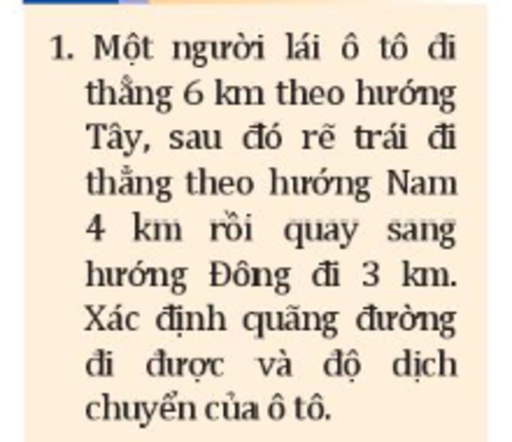 Độ dịch chuyển của ô tô là: \(d = \sqrt {{{\left( {6 - 3} \right)}^2} + {4^2}} = 5\left( {km} \right)\)