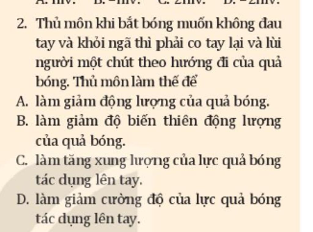 Từ khi quả bóng bắt đầu chạm vào tay với vận tốc v tới khi quả bóng dừng lại, thì độ biến thiên động lượng là: \(\Delta p{\rm{ }} = {\rm{ }}m.\left( {v - 0} \right)\), chỉ phụ thuộc \(v\), không phụ thuộc \(\Delta t\).