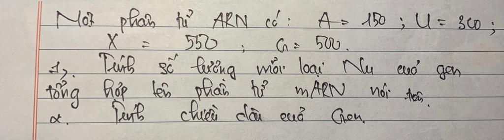 - Số `Nu` mỗi loại của gen đã tổng hợp phân tử `mARN` nói trên là: