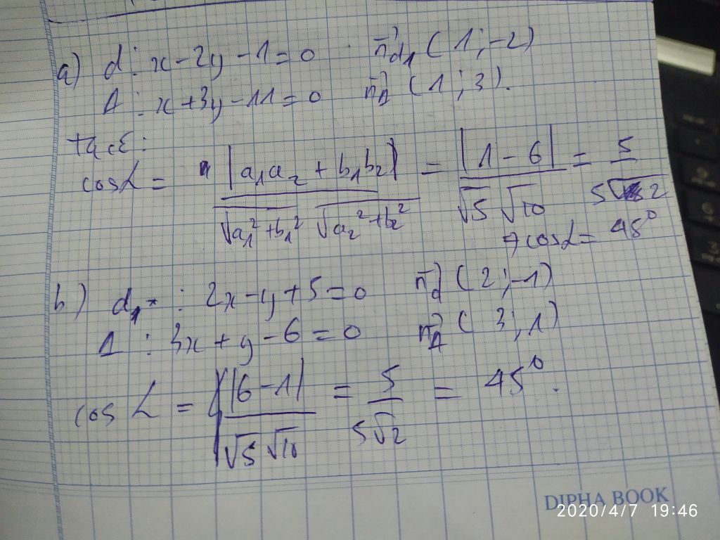 `=>cos\alpha = \frac{|1.1 + (-2).3|}{\sqrt{1^2+(-2)^2}.\sqrt{1^2+3^2}}=\frac{\sqrt{2}}{2}`