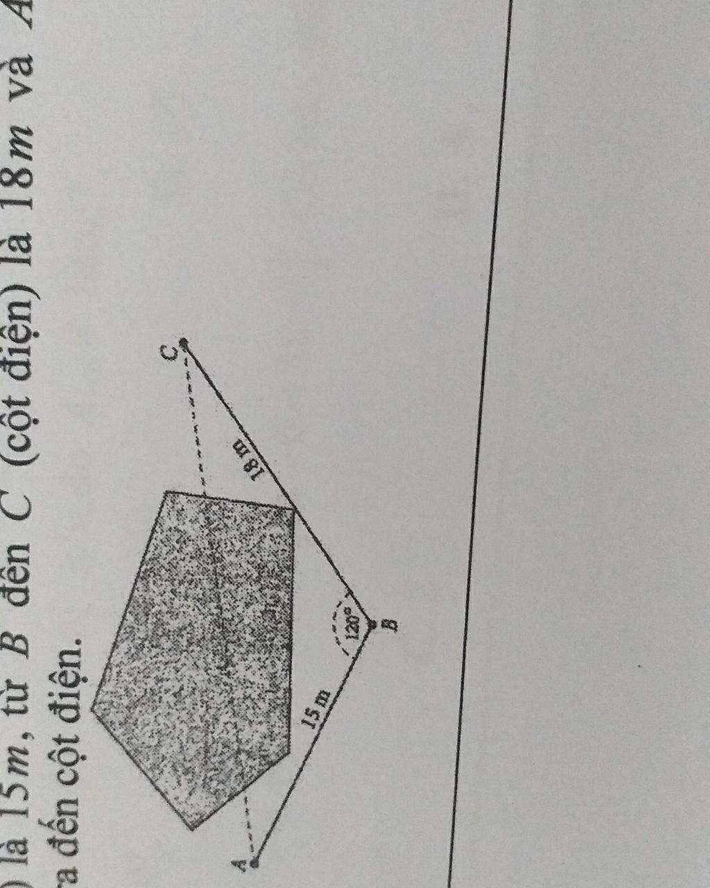 Để kéo dây điện từ cột điện vào nhà phải qua một cái ao,anh Nam không thể đo độ dài dây điện cần mua trực tiếp đc nên đã làm như sau,lấy một điểm B như trong hình ,người ta đo đc độ dài từ B đến A(nhà) là 15m,từ B đến C(cột điện) là 18m và ABC=120°.hãy tính độ dài dây điện nối từ nhà ra đến cột điện