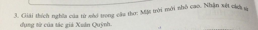`-`Giải thích nghĩa của từ" nhô" trong câu thơ" Mặt trời mới nhô cao": mọc lên, đưa sự vật( mặt trời) cao hơn vị trí bình thường để có thể tỏa ánh sáng bao trùm lên vạn vật: cây cối, nhà cửa, con người,...