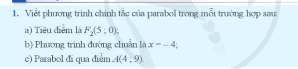 Parabol có tiêu điểm `F_2(5;0)` nên `p/2=5=>p=10`