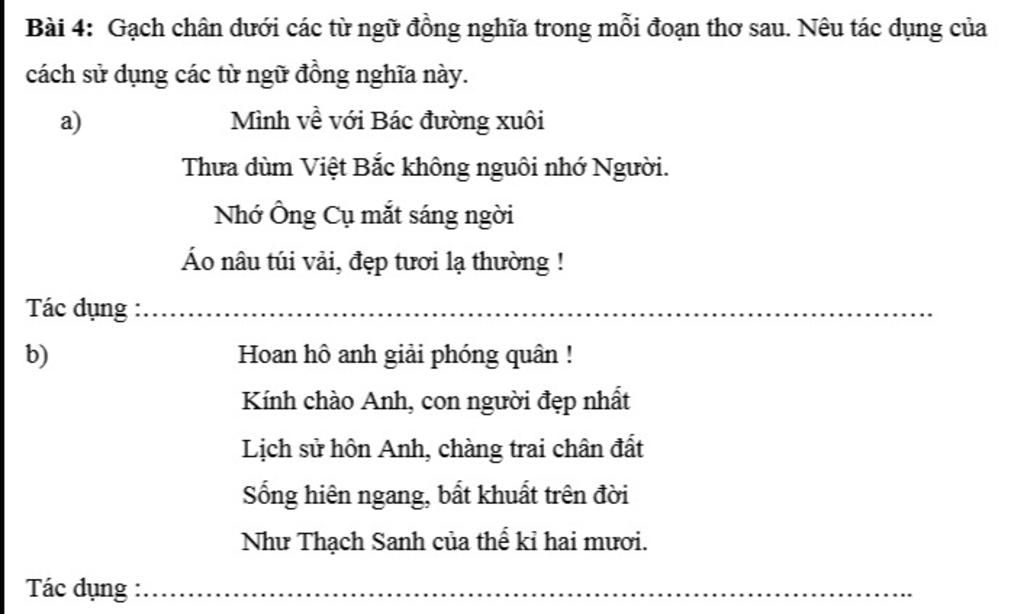 Bài 4: Gạch chân dưới các từ ngữ đồng nghĩa trong mỗi đoạn thơ sau. Nêu tác dụng của cách sử dụng các từ ngữ đồng nghĩa này.