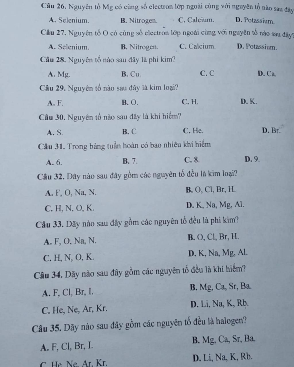 Câu 26. Nguyên tố Mg có cùng số electron lớp ngoài cùng với nguyên tố nào sau đây