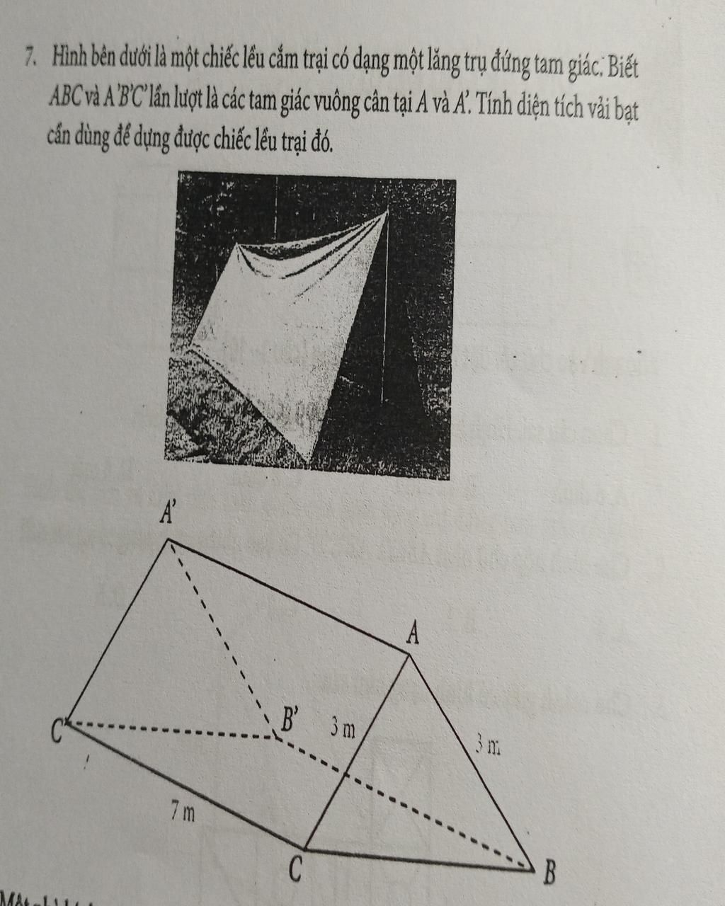 7. Hình bên dưới là một chiếc lều cắm trại có dạng một lăng trụ đứng tam giác. Biết