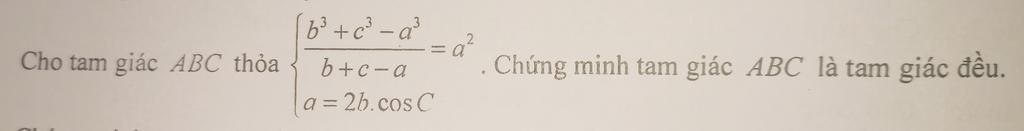 $\begin{cases}\dfrac{b^3+c^3-a^3}{b+c-a}=a^2 \ (1) \\a=2b.cosC \ (2) \end{cases}$