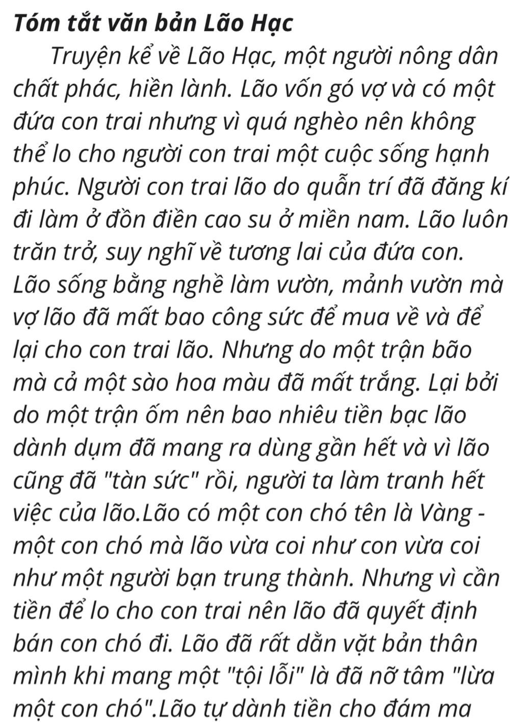 Truyện kể về Lão Hạc, một người nông dân chất phác, hiền lành. Lão vốn gó vợ và có một đứa con trai nhưng vì quá nghèo nên không thể lo cho người con trai một cuộc sống hạnh phúc. Người con trai lão do quẫn trí đã đăng kí đi làm ở đồn điền cao su ở miền nam. Lão luôn trăn trở, suy nghĩ về tương lai của đứa con. Lão sống bằng nghề làm vườn, mảnh vườn mà vợ lão đã mất bao công sức để mua về và để lại cho con trai lão. Nhưng do một trận bão mà cả một sào hoa màu đã mất trắng. Lại bởi do một trận ốm nên bao nhiêu tiền bạc lão dành dụm đã mang ra dùng gần hết và vì lão cũng đã "tàn sức" rồi, người ta làm tranh hết việc của lão.Lão có một con chó tên là Vàng - một con chó mà lão vừa coi như con vừa coi như một người bạn trung thành. Nhưng vì cần tiền để lo cho con trai nên lão đã quyết định bán con chó đi. Lão đã rất dằn vặt bản thân mình khi mang một "tội lỗi" là đã nỡ tâm "lừa một con chó".Lão tự dành tiền cho đám ma của chính mình để không làm phiền đến hàng xóm láng giềng. Lão không nhận bất kỳ sự giúp đỡ của bất kỳ ai. Lão đã chọn một cái chết bằng bả chó, một cái chết dữ dội và đau đớn. Lão làm thế là để trừng phạt bản thân mình đã làm cái việc dằn vặt, tội lỗi ấy và có thể lão đã được giải thoát sau bao tháng ngày cùng cực, đau khổ.Truyện được thể hiện qua lời kể của nhân vật tôi - một ông giáo và dường như đâu đó trong nhân vật này ta thấy hiện lời giọng kể của tác giả.