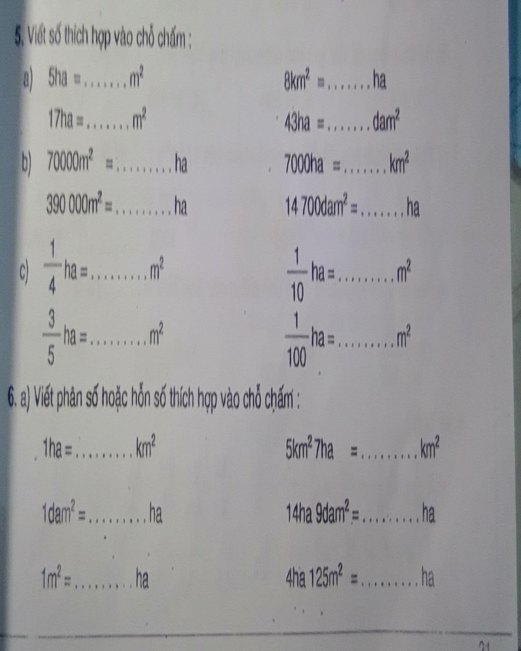 `1` ha `= 0,01` `km^2` `5` `km^2` `7` ha `= 5,7` `km^2`