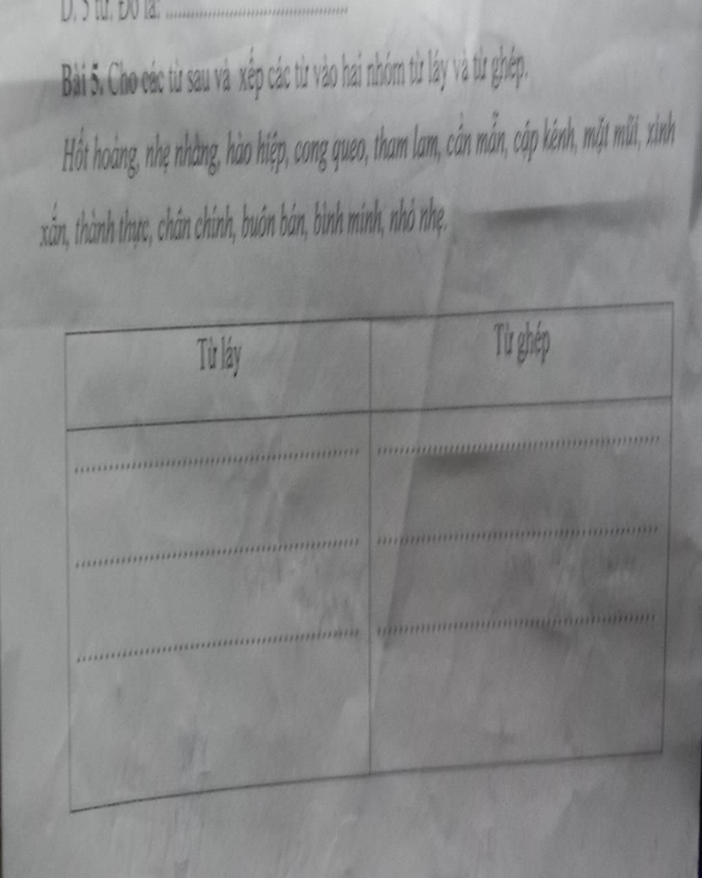 Cho các từ sau và xếp các từ vào hai nhóm từ láy và từ ghép. Hốt hoảng, nhẹ nhàng, hào hiệp, công queo, tham lam, cần mẫn, cập kênh, mặt mũi, xinh xắn, thành thực, chân chính, buôn bán, bình minh, nhỏ nhẹ.