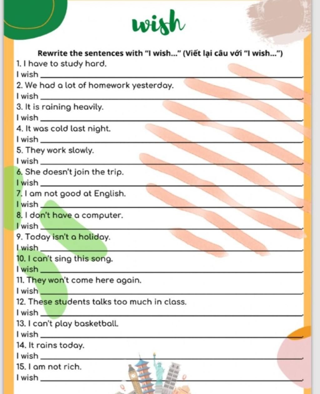 `@`Cấu trúc câu điều ước ở tương lai : S + wish(es) + S + would/could (not) + V bare