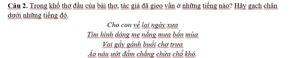 Câu 2. Trong khổ thơ đầu của bài thơ, tác giả đã gieo vần ở những tiếng nào? Hãy gạch chân