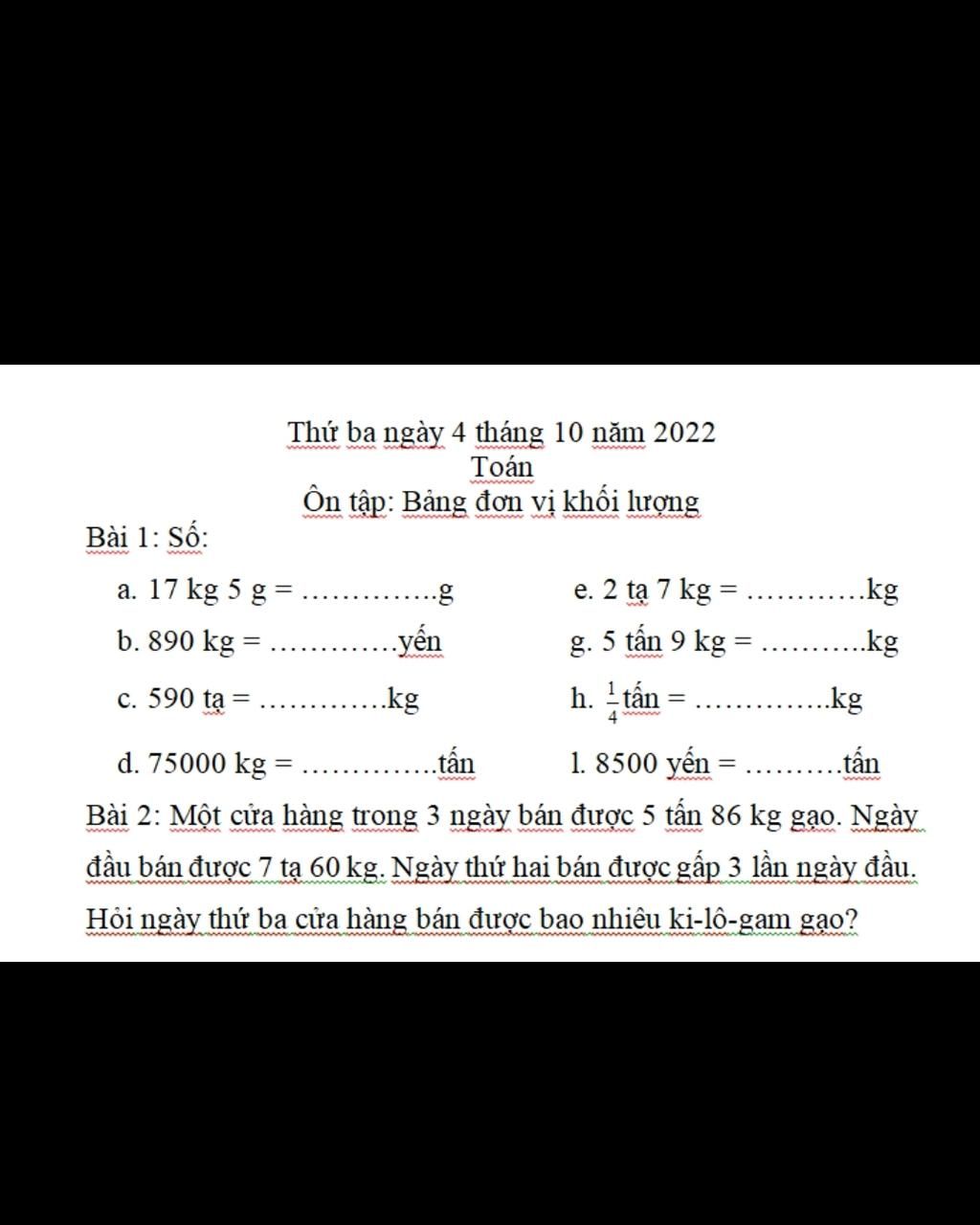g) `5` tấn `9` kg = `5009` kg