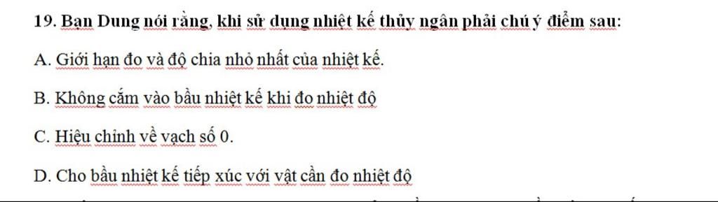 19. Bạn Dung nói rằng khi sử dụng nhiệt kế thủy ngân phải chú ý điểm sau: