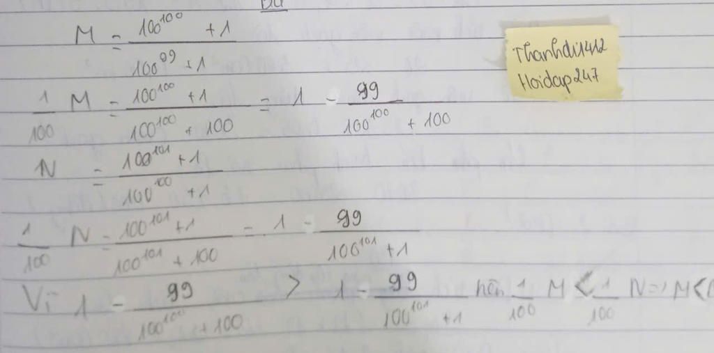 Vì `100^99+1 < 100^100+1 =>99/(100^99+1) > 99/(100^100+1)=> 100 - 99/(100^99+1) <100 - 99/(100^100+1)`