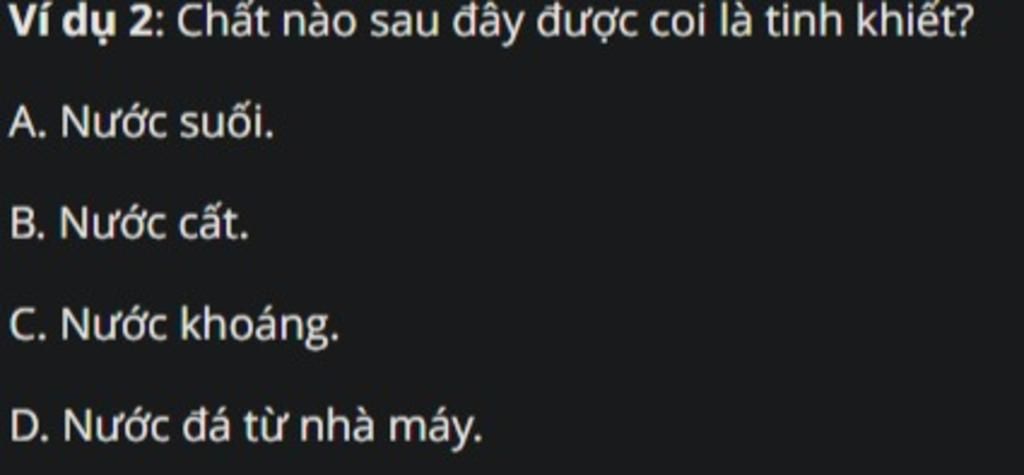 Nước cất là chất tinh khiết vì nước cất đã được chưng cất để loại bỏ các tạp chất
